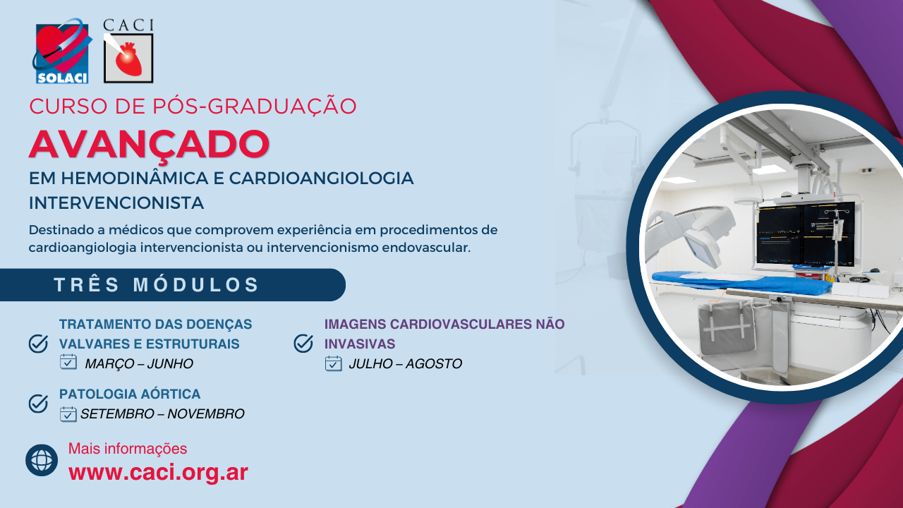 Já estão abertas as inscrições para o Curso de Pós-Graduação Avançado SOLACI–CACI em Hemodinâmica e Cardiologia Intervencionista – Edição 2026.